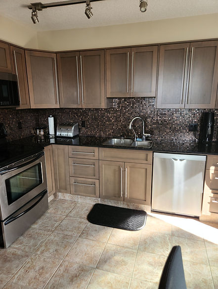 Constructing the doors was by far the easy part, stain matching a 15 year old kitchen and having to match the upper was a challenge. After spray staining with an airbrush, layers of glass like clear coat were applied. The result shocked our client, the greatest response we could ask for " I can't even tell they are new".